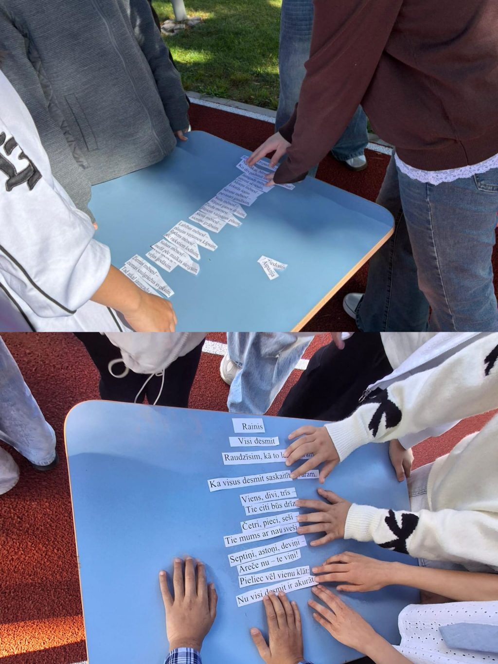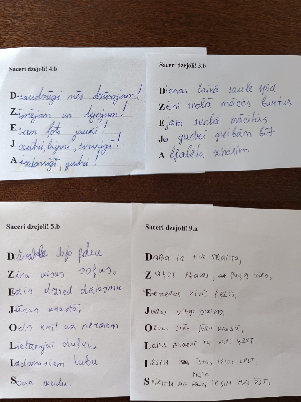 Skolēni veica dažādus uzdevumus 4 darba stacijās – salika dzejoļa rindas pareizā secībā, sacerēja savus dzejoļus, spēlēja tautasdziesmu mēmo šovu un dziedāja dziesmas. Šādi pasākumi ir nozīmīgi ne tikai Latvijas kultūras mantojuma saglabāšanā un nodošanā nākamajām paaudzēm, bet arī klases kolektīvu saliedēšanā un sadarbības prasmju attīstībā.