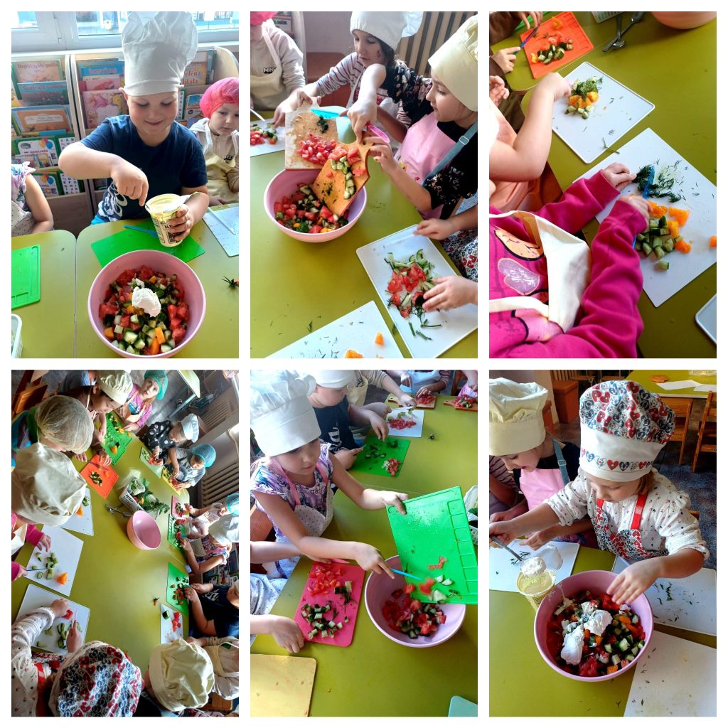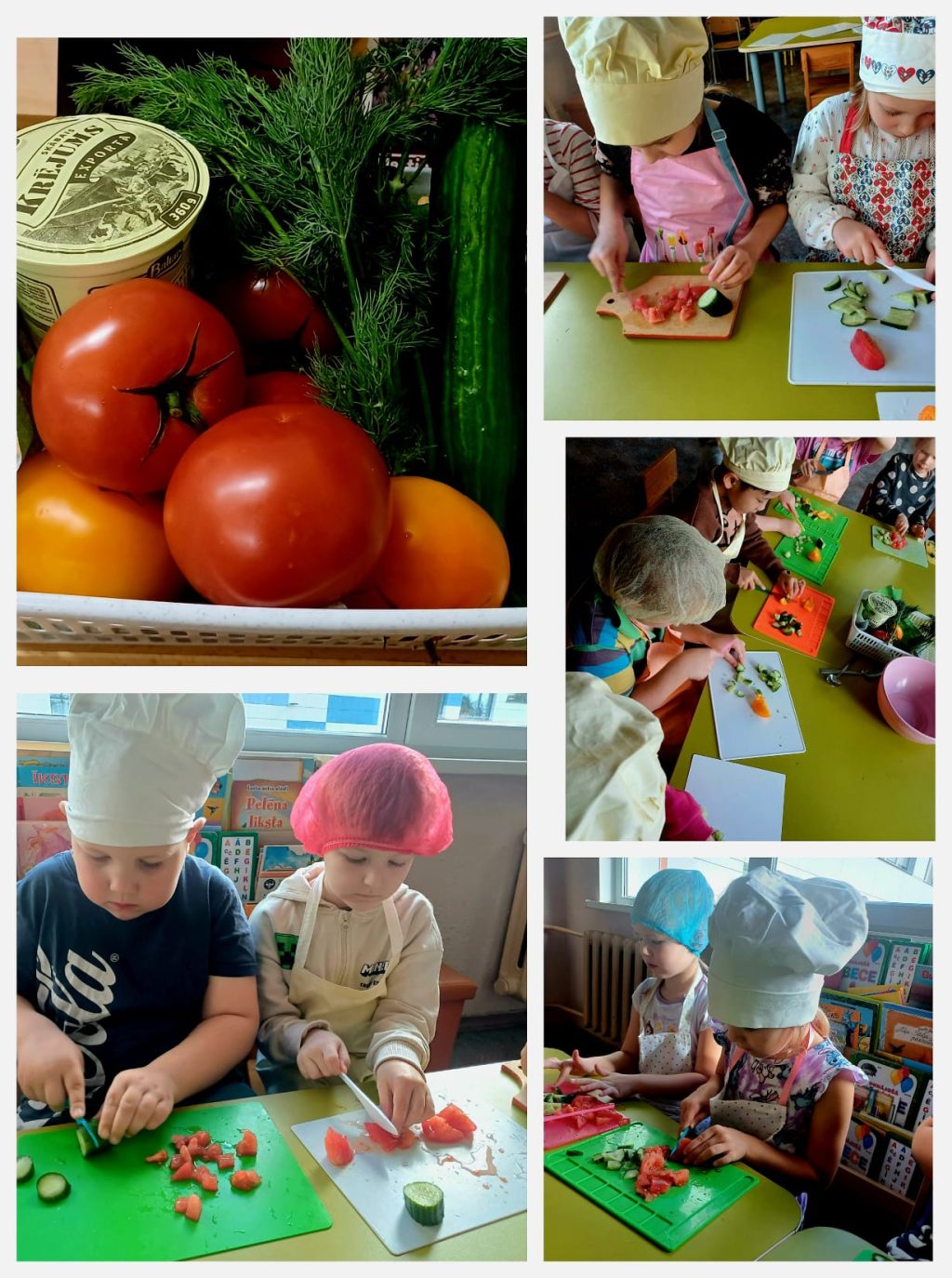 Iegūtās zināšanas bērni nostiprināja praktiskā darbībā – paši gatavoja krāsainus un vitamīniem bagātus dārzeņu salātus! 🥕🥒🍅