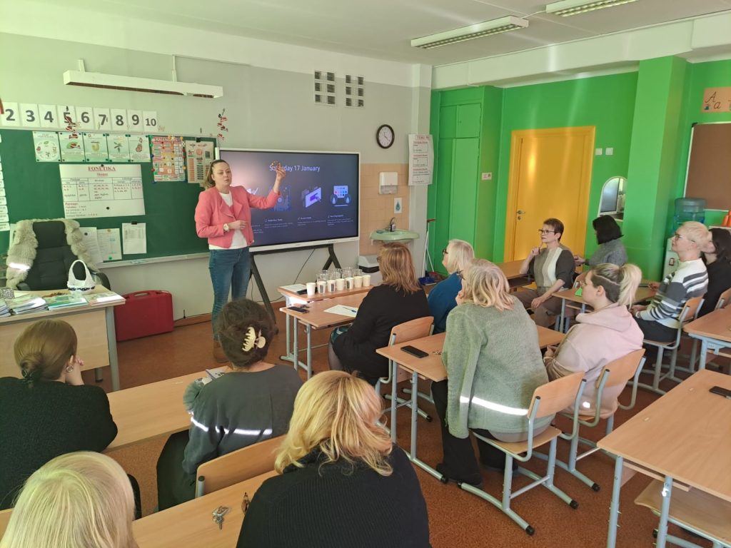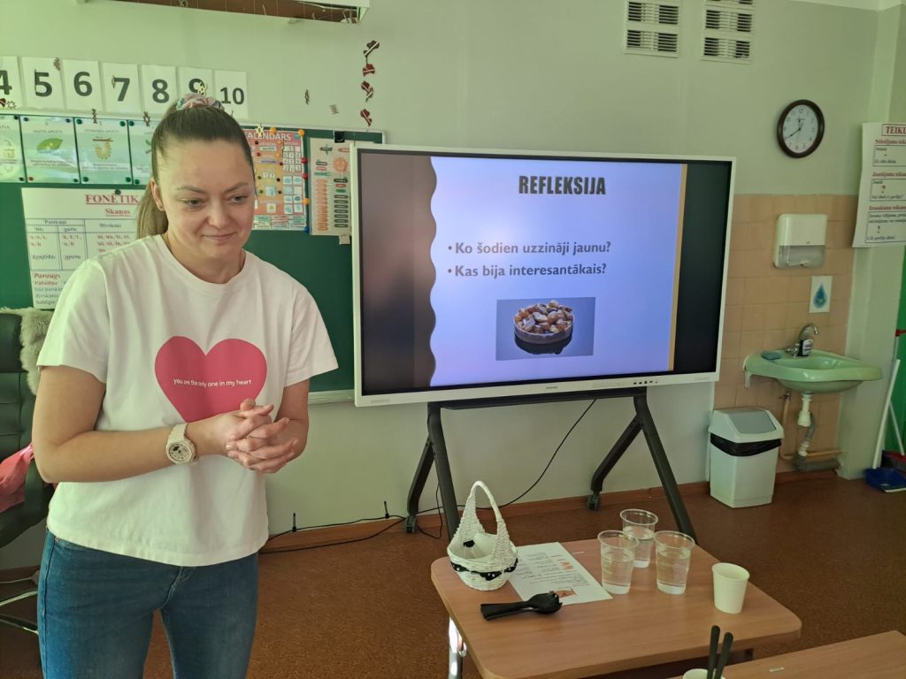 Sākumskolas skolotāja Indra kolēģus uzaicināja uz dabaszinību mācību stundu “Baltijas zelts – dzintars”. Nodarbības pirmajā daļā skolotāja, izmantojot vairākas darba metodes, demonstrēja, kā interesanti var apgūt teoriju, kurā tika skaidrota dzintara izcelsme un tā īpašības. Otrajā daļā tika organizēta praktiska, eksperimentāla darbība, kuras laikā kolēģi veica eksperimentu ar dzintaru. Pedagoģiskās darbnīcas laikā pedagogi sadarbojās, dalījās pieredzē, kādā veidā skolēniem var jēgpilnāk pilnveidot izpratni un sniegt jaunas zināšanas par dzintara daudzveidību un tā īpašībām.